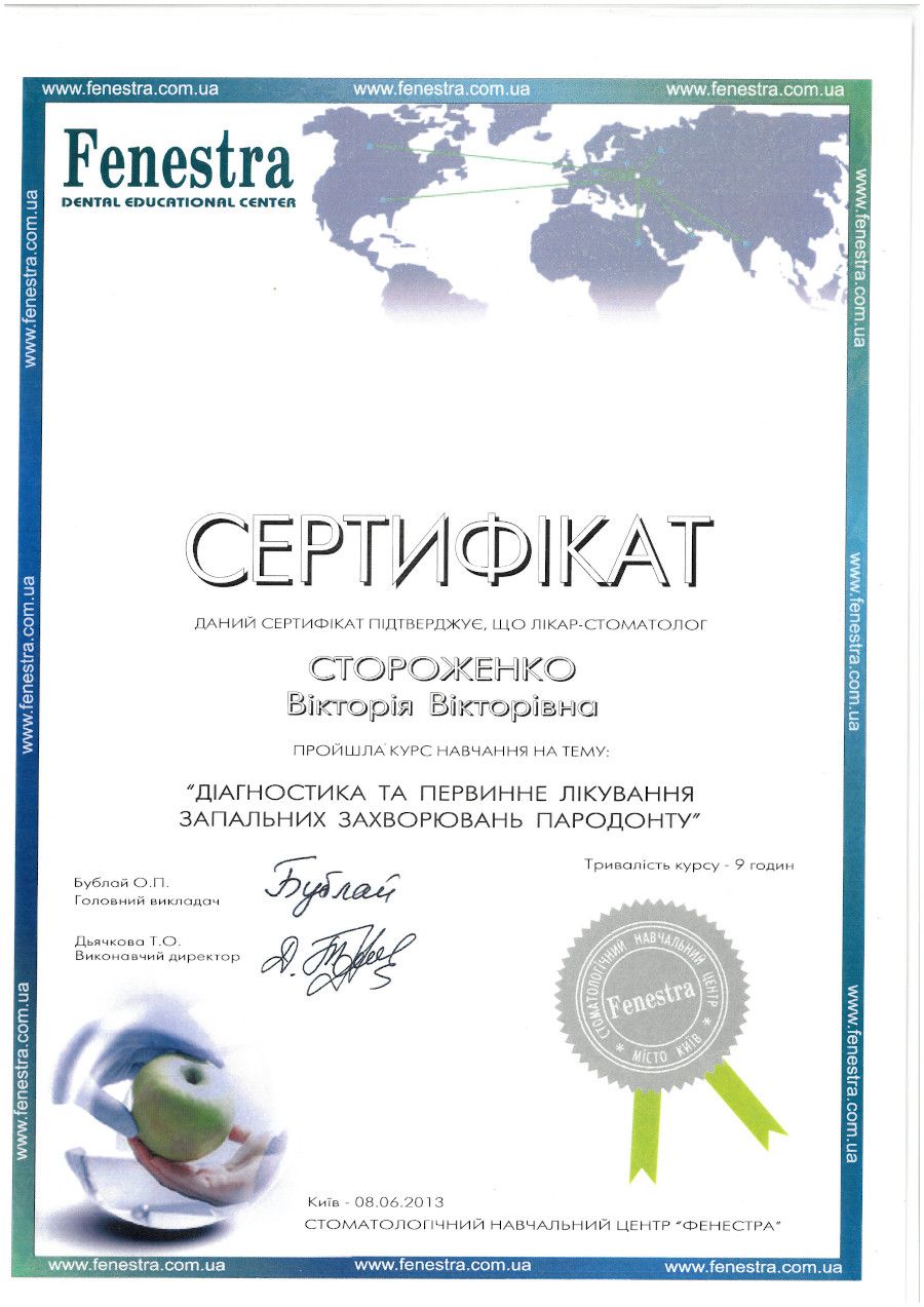 “Діагностика та первинне лікування запальних захворювань парадонту”, 2013 рік, Київ.