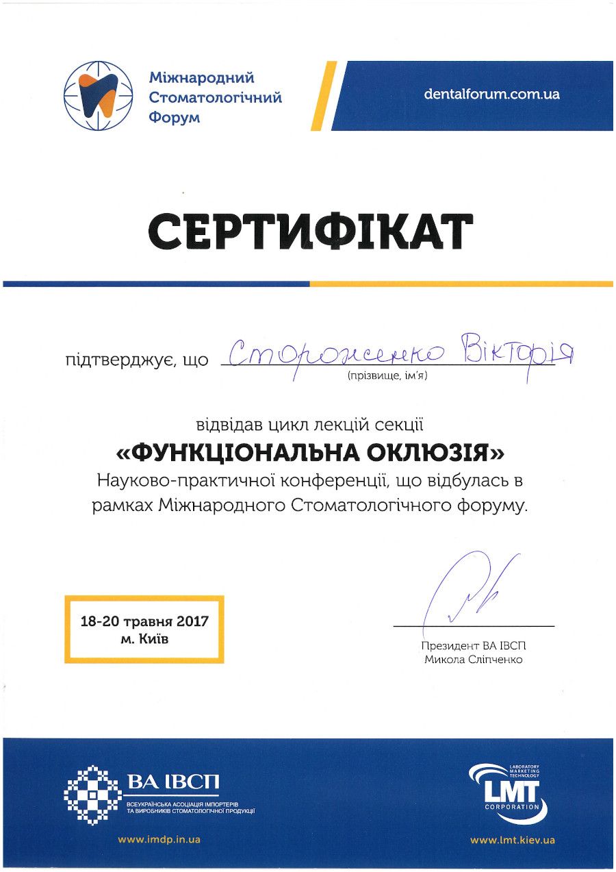 Міжнародний Стоматологічний форум, секція “Функціональна оклюзія”, 2017 рік, Київ.