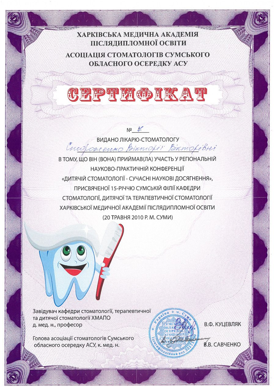 “Дитяча стоматологія – сучасні наукові досягнення”, 2010 рік, Суми.