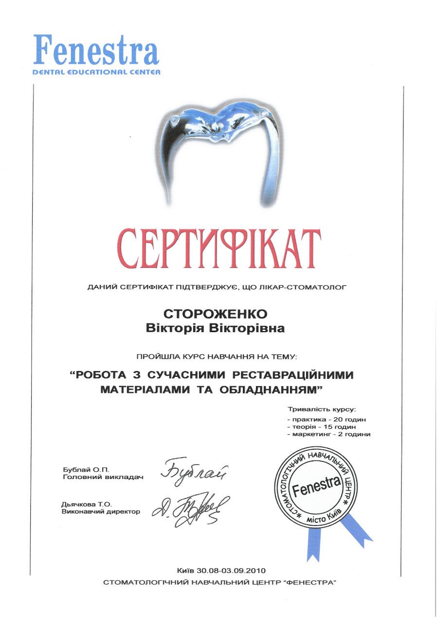 “Робота з сучасними реставраційними матеріалами та обладнанням”, 2010 рік, Київ.