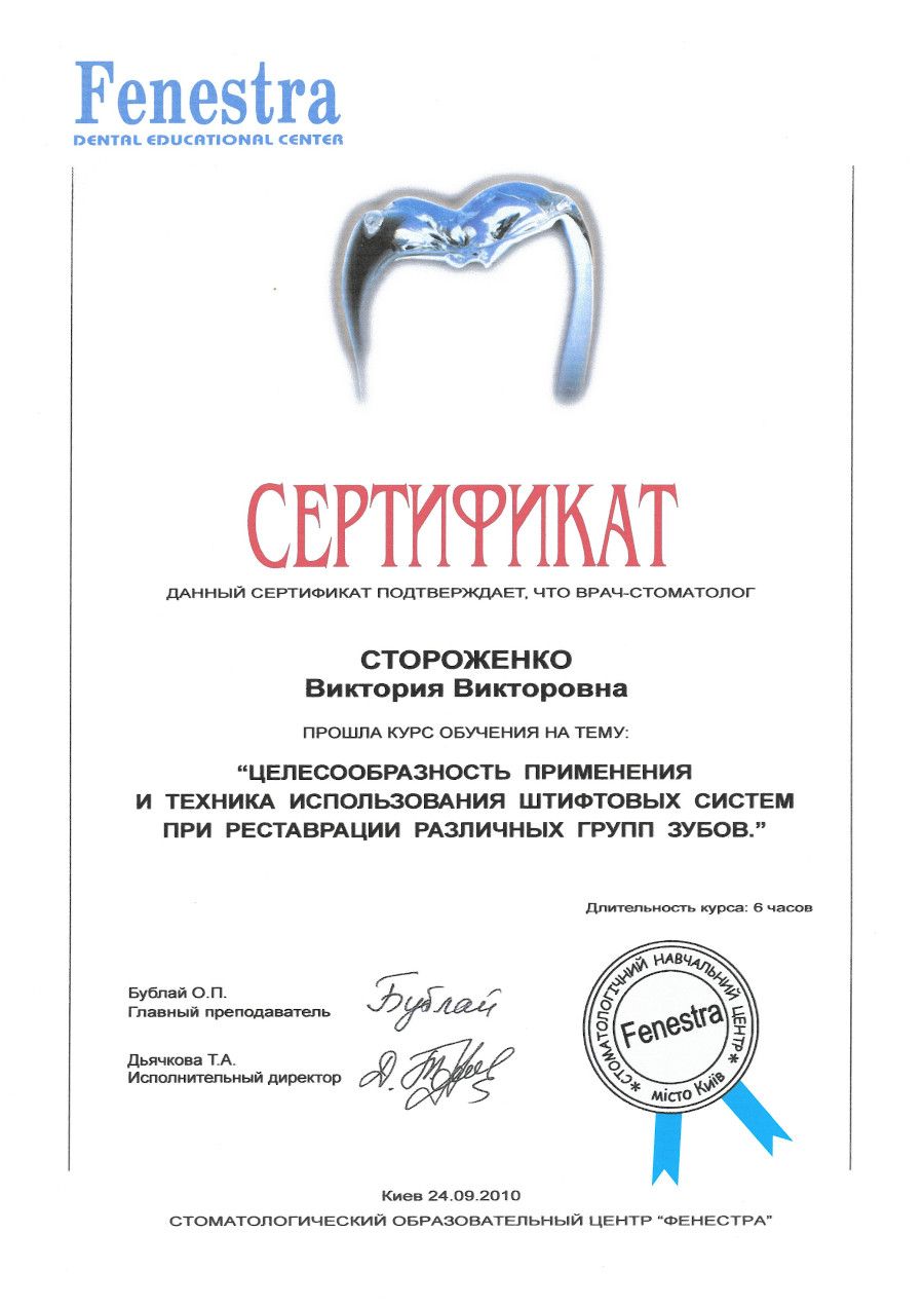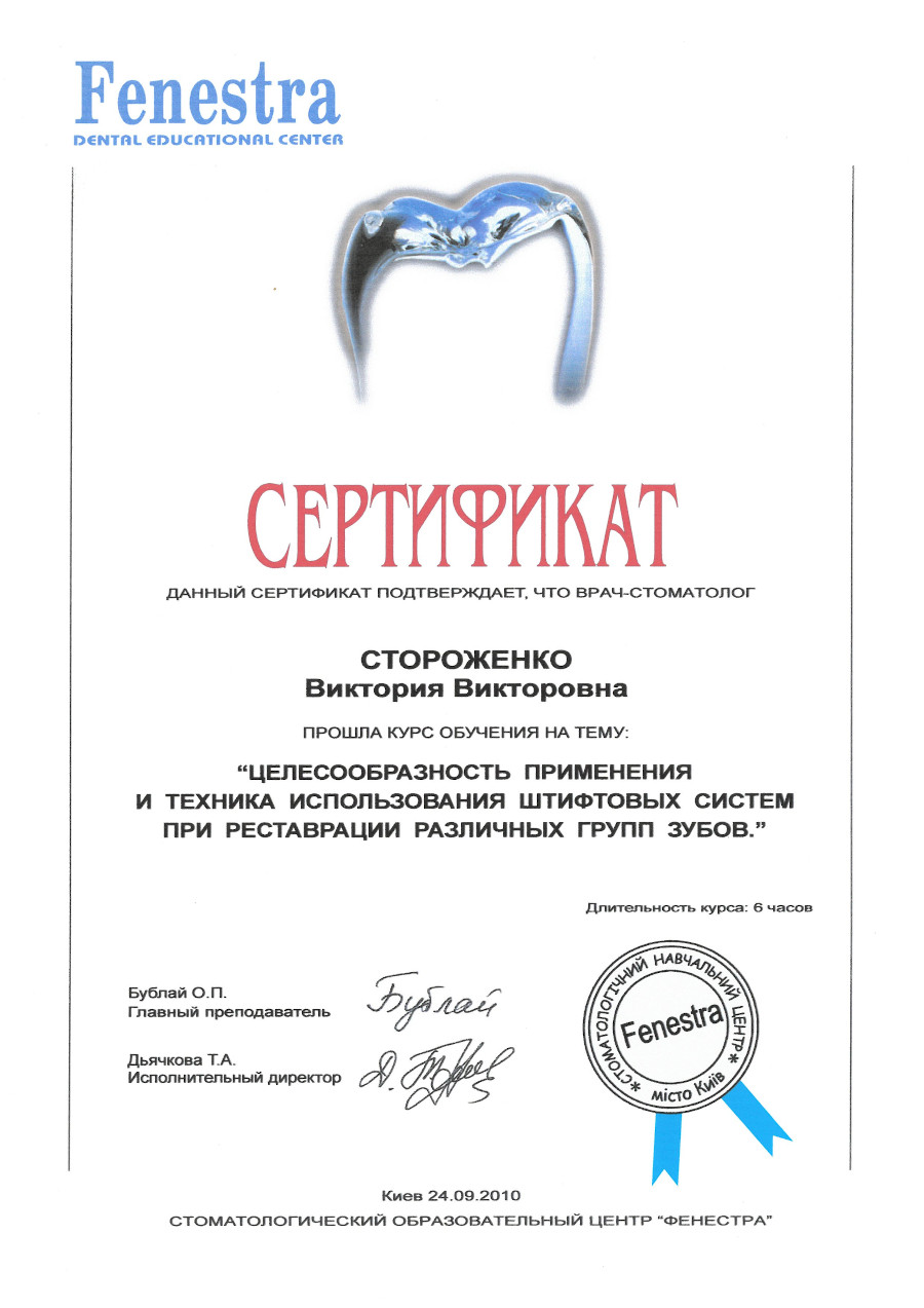 “Целесообразность применения и техника использования штифтовых систем при реставрации различных групп зубов”, 2010 рік, Київ.