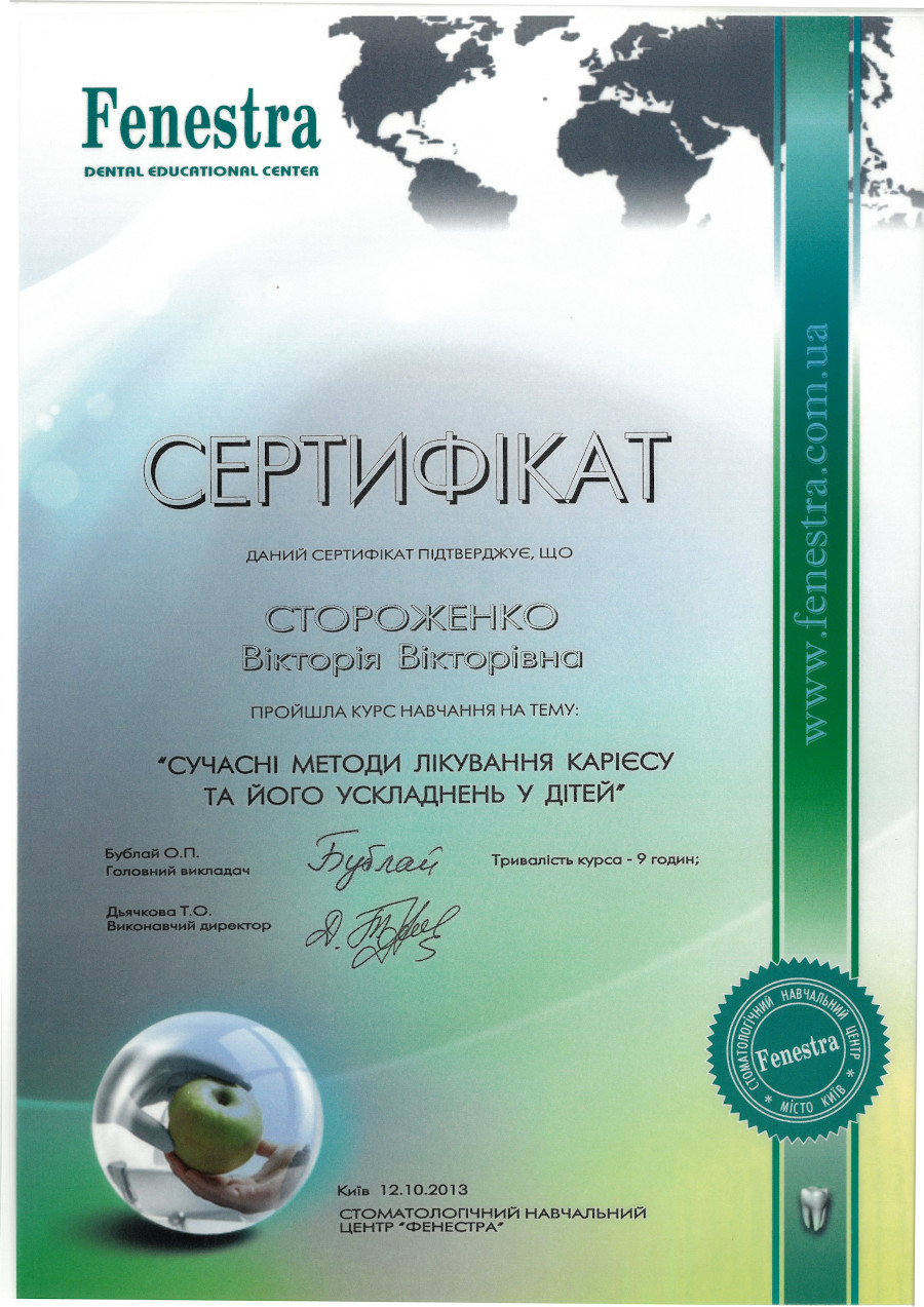 “Сучасні методи лікування карієсу та його ускладнень у дітей”, 2013 рік, Київ.