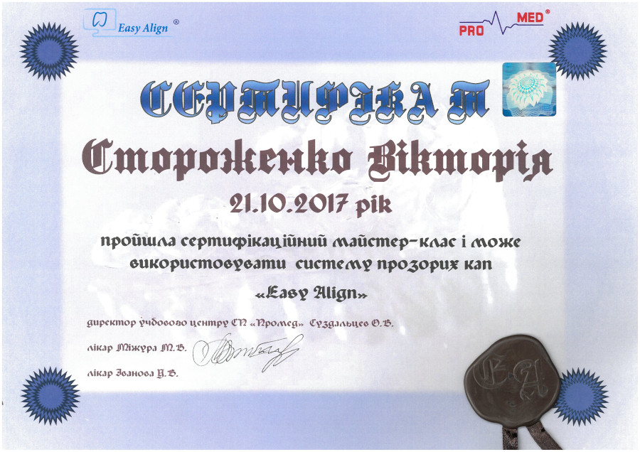 Сертифікований майстер-клас “Система прозрачных кап Easy Align”, 2017 рік, Київ.